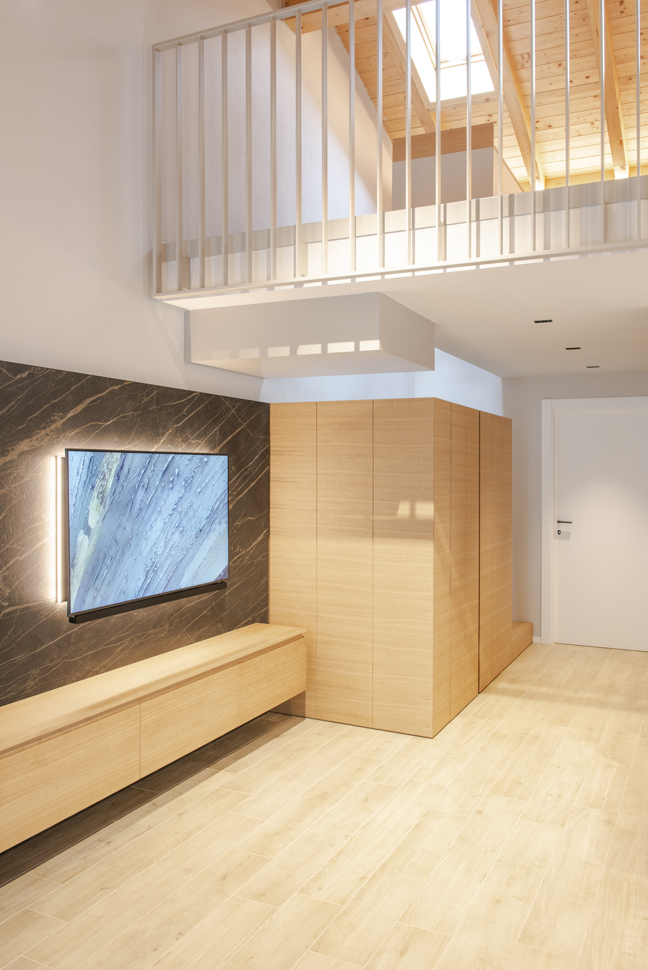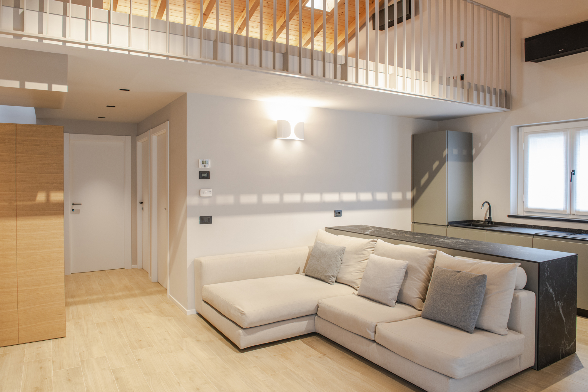 Progetto di interior design per una villetta unifamiliare di nuova costruzione con ampia zona giorno e soppalco. Gli spazi sono studiati per unire bellezza estetica e praticità, con zona giorno e zona notte ben distinte e con spazi "jolly" che possano adattarsi alle esigenze di una famiglia che cambia. Il servizio fotografico è realizzato da Matteo Felici